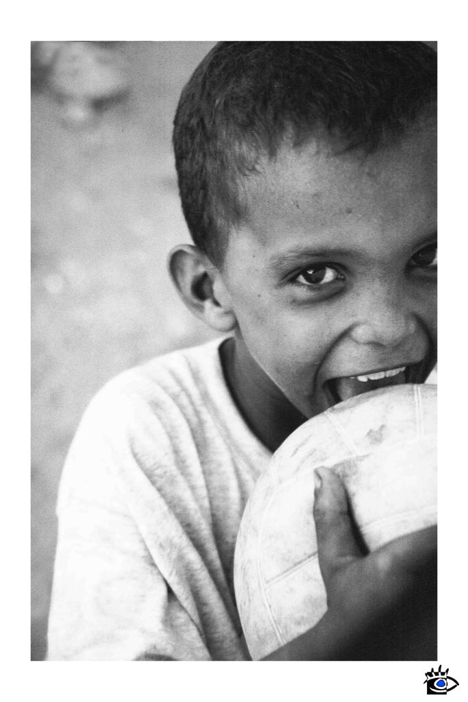 L’ho fotografato mentre sorrideva, con le gomme da masticare strette nel pugno che però non lasciavano andare una palla logora, forse unico suo tesoro. Il sole al tramonto dipingeva il suo viso con una luce dorata, facendo brillare i suoi occhi colmi di gratitudine per un gesto così semplice eppure così significativo.