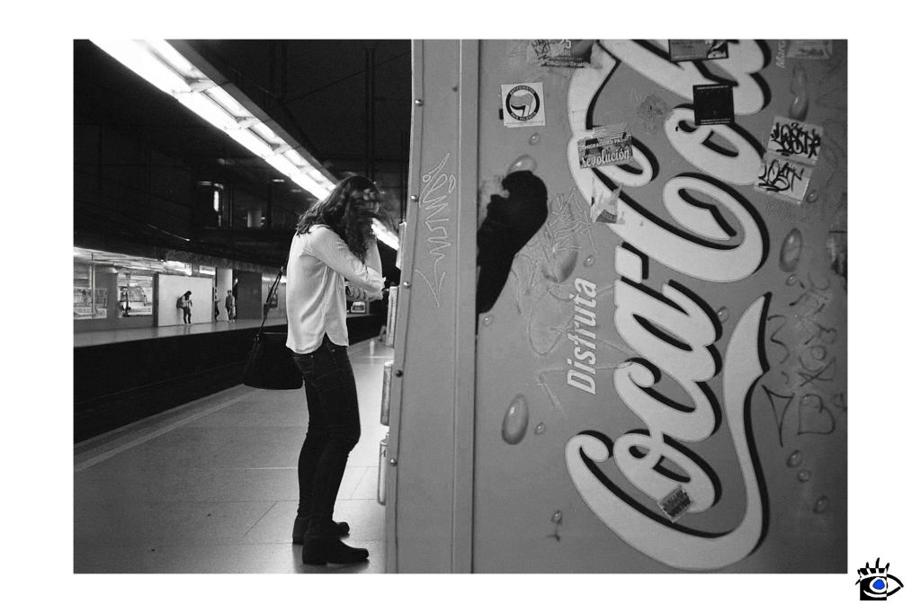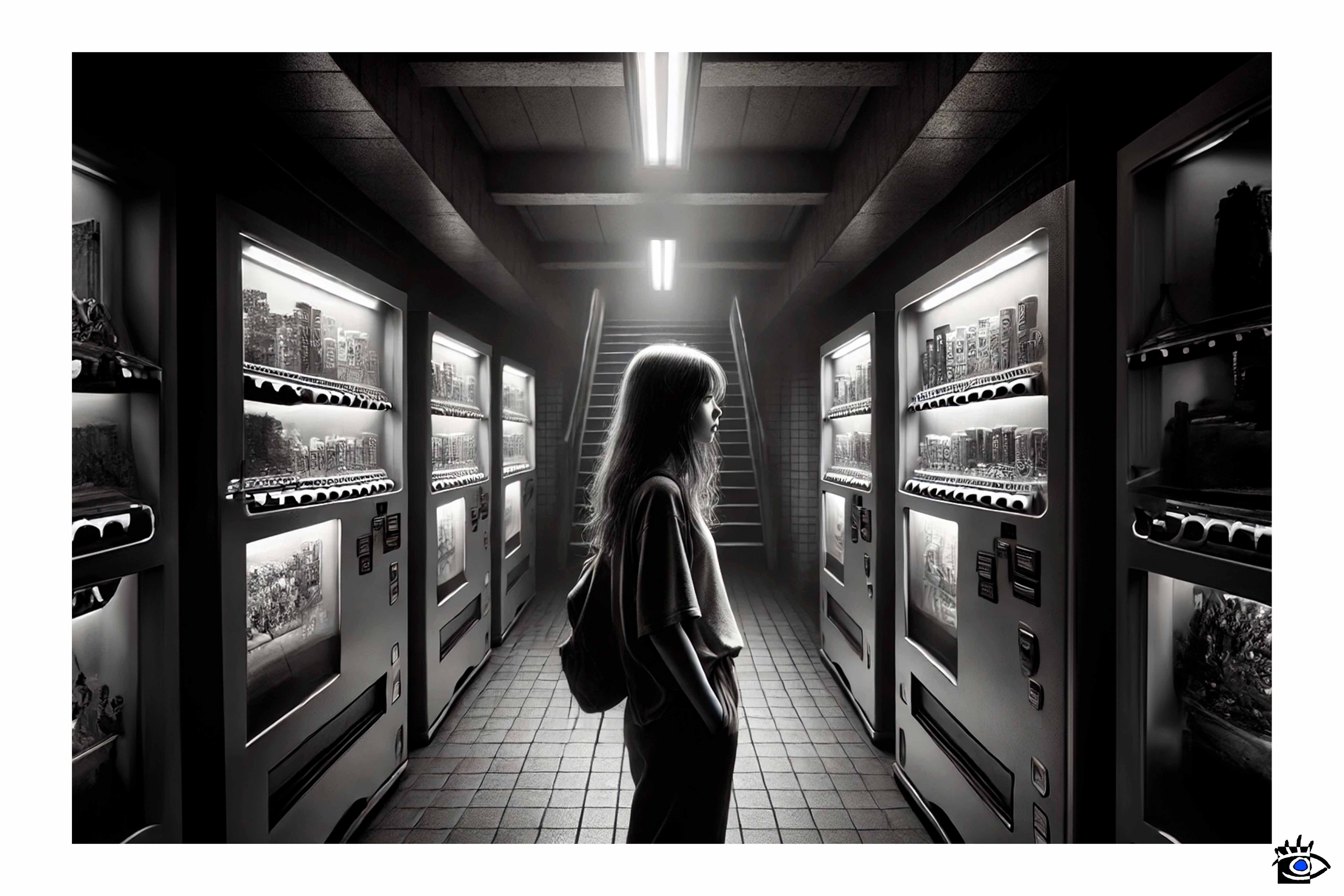 Davanti a me, una ragazza, sola davanti a un distributore automatico. La sua figura mi ha subito catturato, sospesa in una contemplazione quasi metafisica mentre esaminava le lattine e le bibite in esposizione. Ogni gesto era lento, ponderato, come se la scelta da fare fosse di vitale importanza. In quel contrasto tra la frenesia della superficie e la quiete sotterranea, ho deciso di immortalare la scena con la mia macchina fotografica.