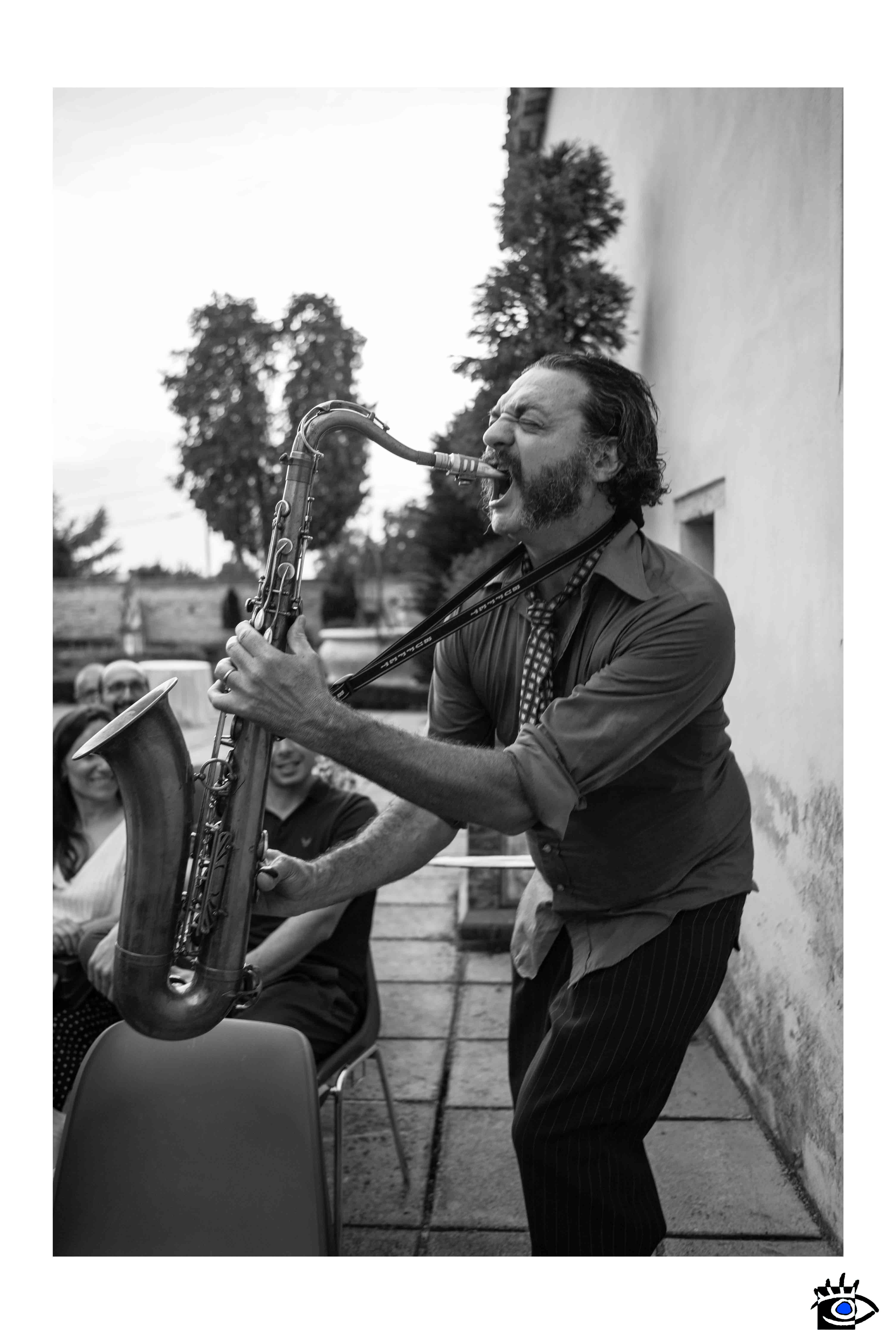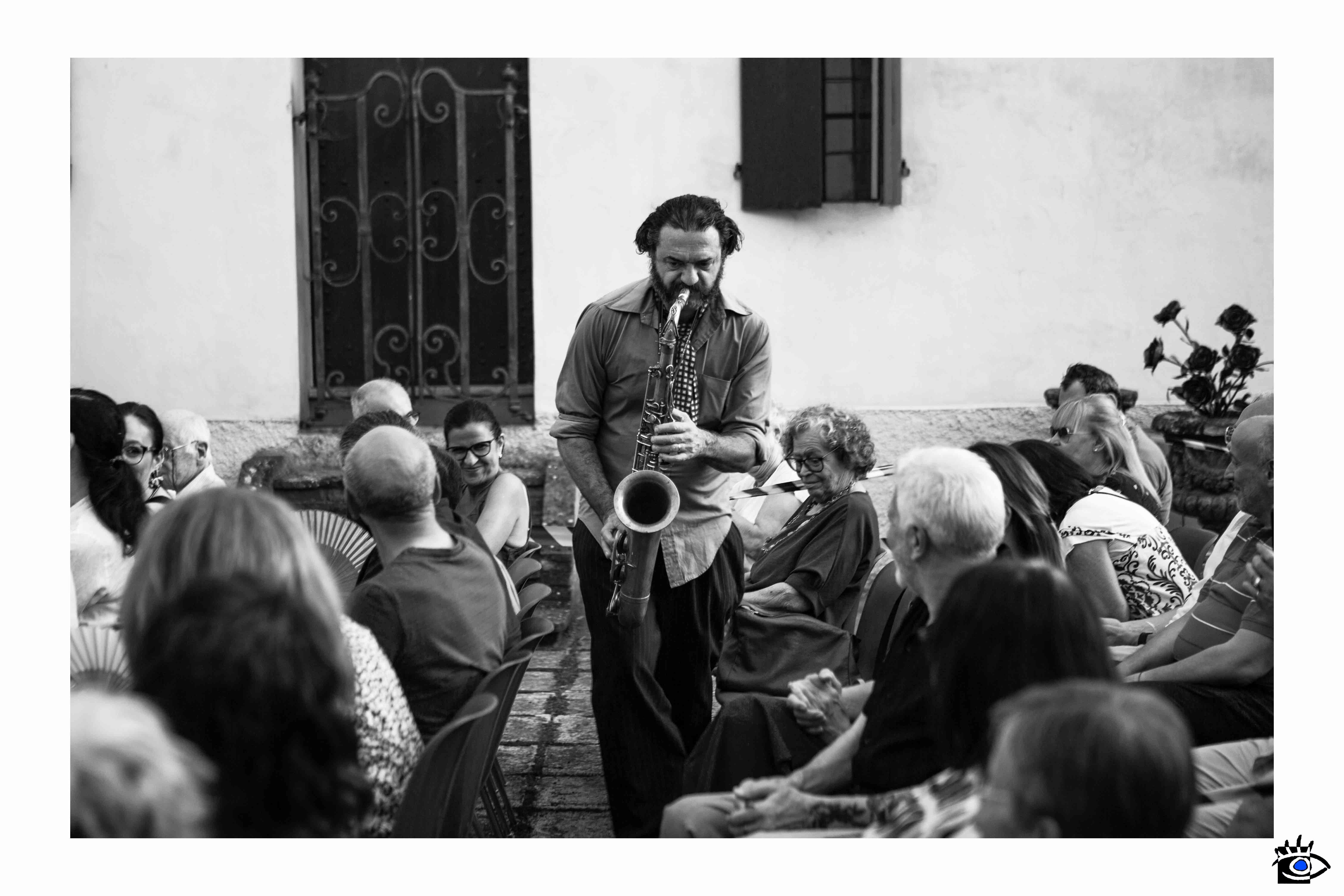 Dal punto di vista tecnico, fotografare Attacchi di Swing è stato tutto fuorché semplice. Il palco improvvisato nel giardino era incastrato tra i muri chiari della villa e il sole che tramontava dritto negli occhi. Niente luci da concerto regolari, ma ombre dure da un lato e luce calda, quasi abbagliante, dall’altro. Un incubo per chi – come me – non ama stravolgere gli scatti in post-produzione.
