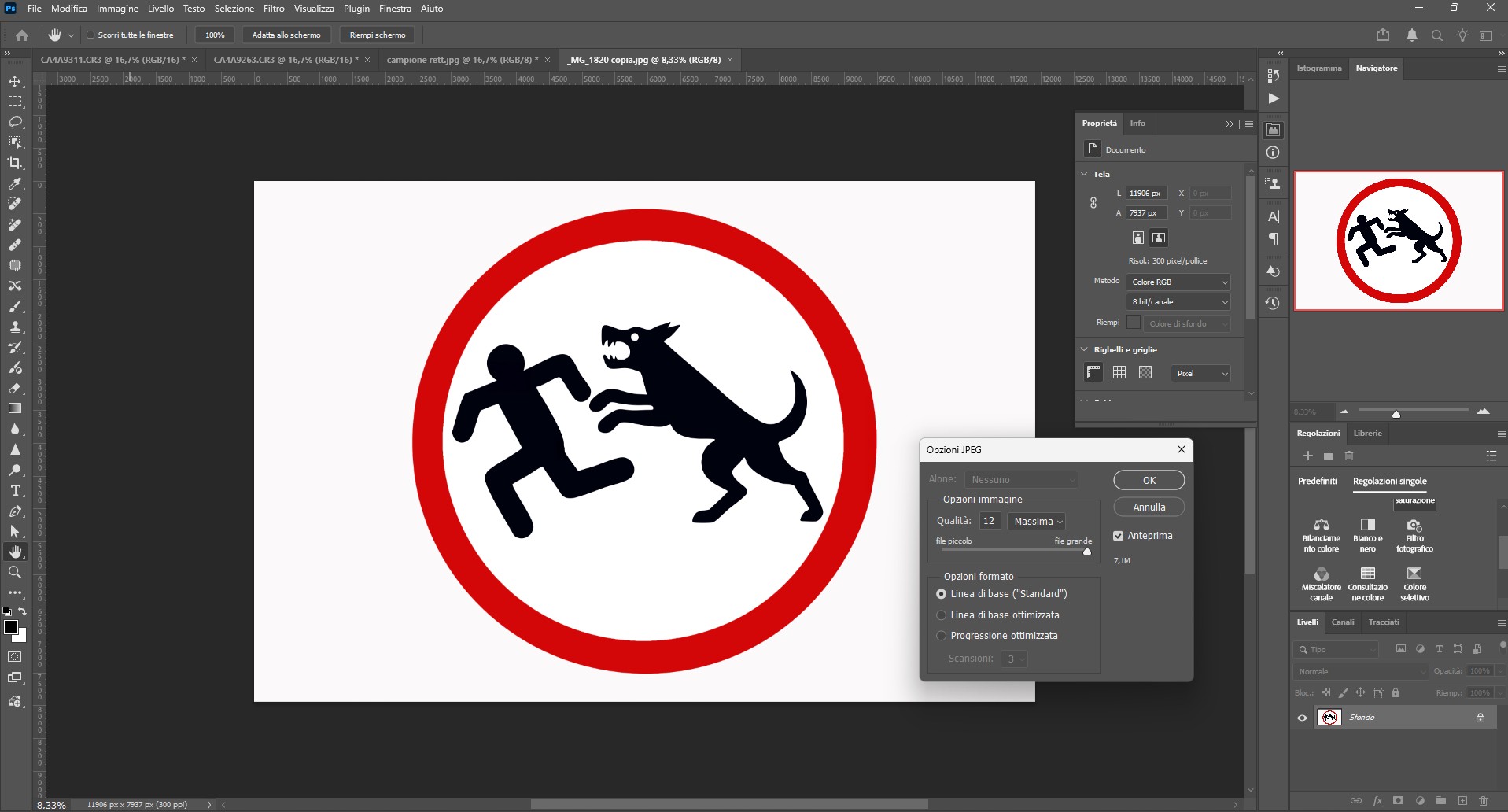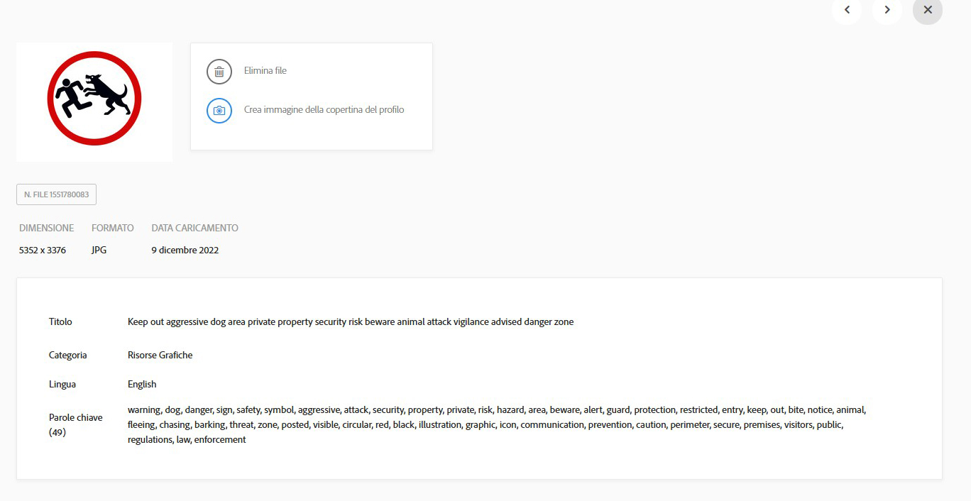 Io ho creato una grafica vettoriale (un pittogramma di avviso: figura umana in fuga e cane in attacco, dentro un cerchio rosso). L’ho messa in vendita su Adobe Stock.