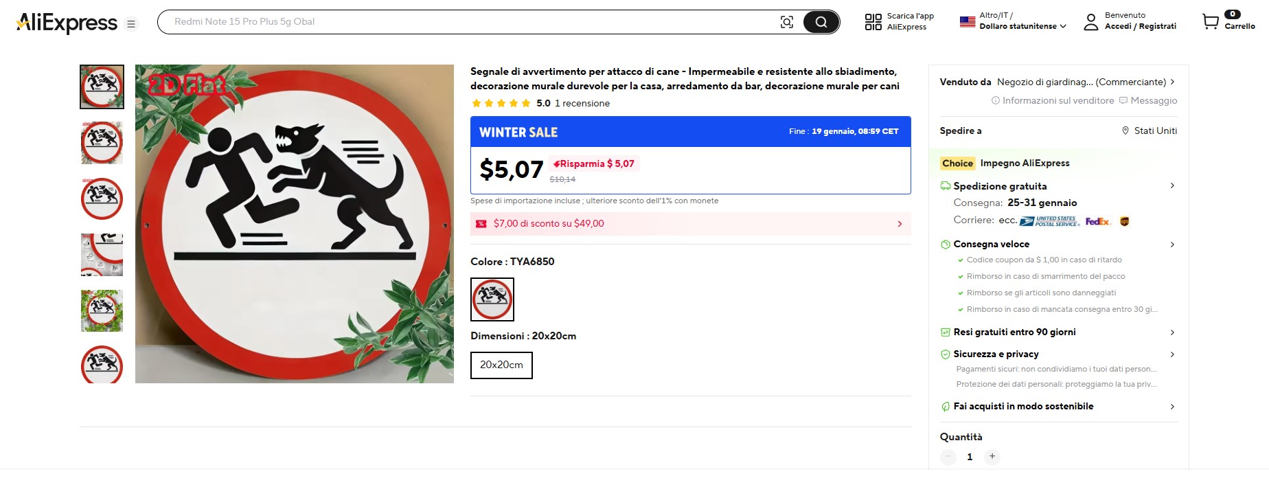 Poi me la ritrovo su AliExpress come prodotto fisico (cartello), con una resa sostanzialmente equivalente: stessa composizione, stesso linguaggio grafico, stessa idea leggibile in un colpo d’occhio. Cambi marginali? Possibile. Ma l’impianto è quello.